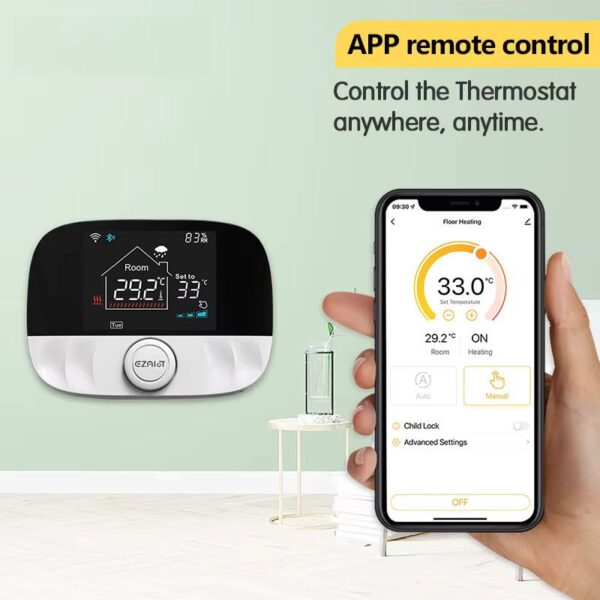 Особенности | Защита от детей (блокировка кнопок), Программируемый режим (недельное рассписание 5+1+1), Ручной режим, Удаленное управление со смартфона через WiFi всеми функциями термостата, Функция "Защита от замерзания", Функция "Открытое окно" |