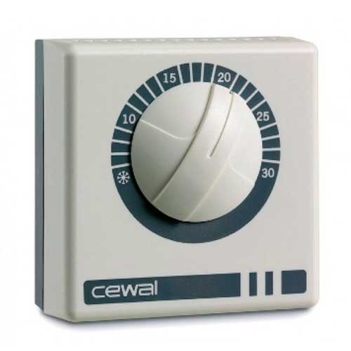 Терморегулятор Cewal RQ01 – электромеханический прибор со встроенным газонаполненным сильфоном и предназначен для автоматической регулировки температуры воздуха в помещении. Подключается к электрическим, газовым и жидкотопливным источникам обогрева. Принцип действия терморегулятора Cewal RQ01 заключается в том, что при изменении температуры в помещении газ, сжимаясь или расширяясь, замыкает или размыкает контакты, тем самым включает или выключает оборудование, подключенное к нему. Комнатный терморегулятор Cewal RQ01 обеспечивает постоянную температуру и работает по принципу биметаллической пружины, давая команду на включение или выключение оборудования по заданной температуре той комнаты, в которой он установлен. Установка не требует специальных знаний и навыков, нужно всего лишь подсоединить два медных провода сечением 0,75 мм2 (при длине проводов больше 10 м нужно увеличить сечение) по которым передаются команды управления. После того как произведено подключение, терморегулятор сразу готов к работе. Задать нужную температуру можно поворотом ручки с делениями.