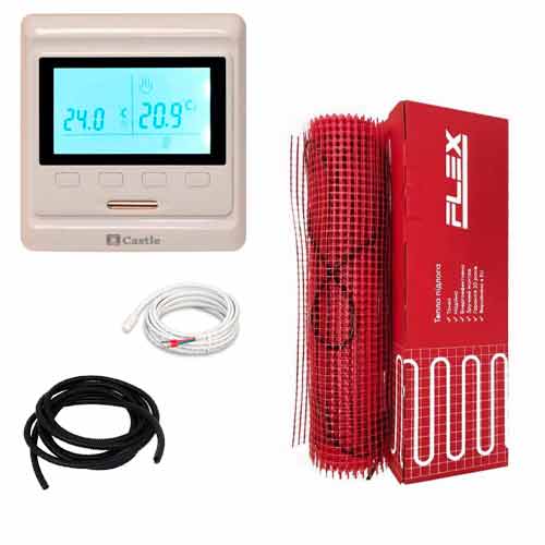 Комплектация | Нагревательный двухжильный мат | Терморегулятор программируемый с двумя датчиками (пол + воздух)| Защитная гофрированная трубка для датчика температуры | Гарантийный талон |