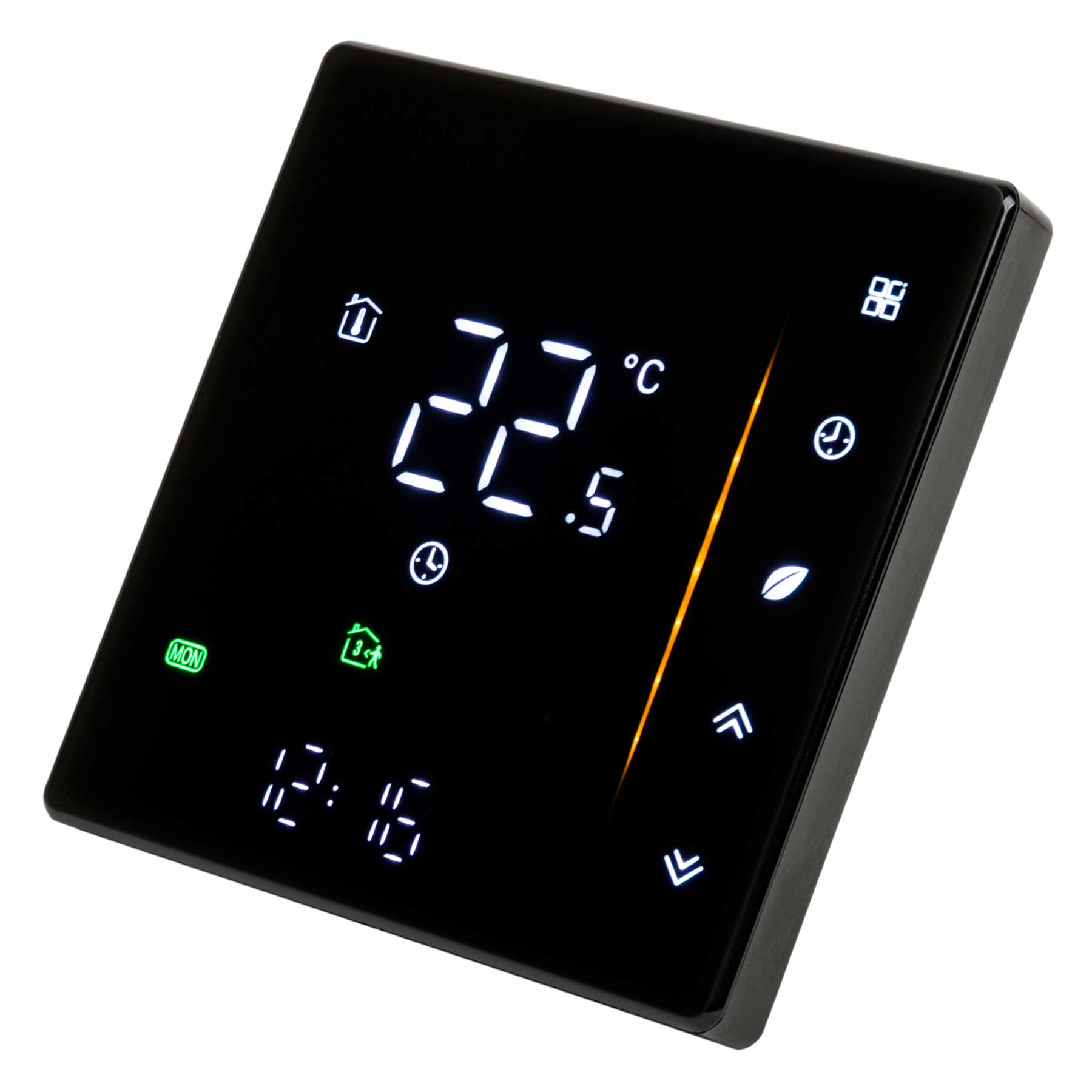 Контроль температуры пола осуществляется благодаря выносному датчику температуры пола (в комплекте) или датчику температуры воздуха (встроенный в корпус). Настройка производится сенсорами на лицевой панели или через приложение в смартфоне. Устанавливается в подрозетник формата 65х45 или 65х60.