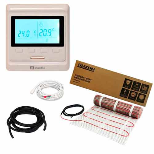 Комплектация | Нагревательный двухжильный мат | Терморегулятор программируемый с двумя датчиками (пол + воздух)| Защитная гофрированная трубка для датчика температуры | Гарантийный талон |