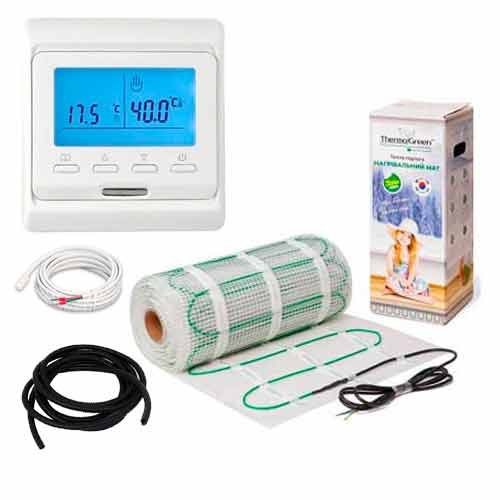 Комплектация | Нагревательный двухжильный мат | Терморегулятор программируемый | Защитная гофрированная трубка для датчика температуры | Гарантийный талон |