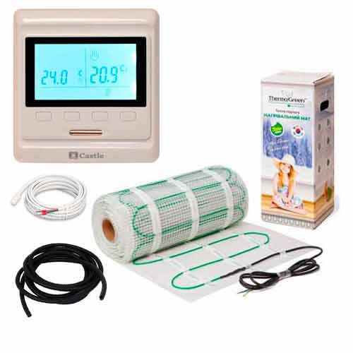 Комплектация | Нагревательный двухжильный мат | Терморегулятор программируемый с двумя датчиками (пол + воздух)| Защитная гофрированная трубка для датчика температуры | Гарантийный талон |