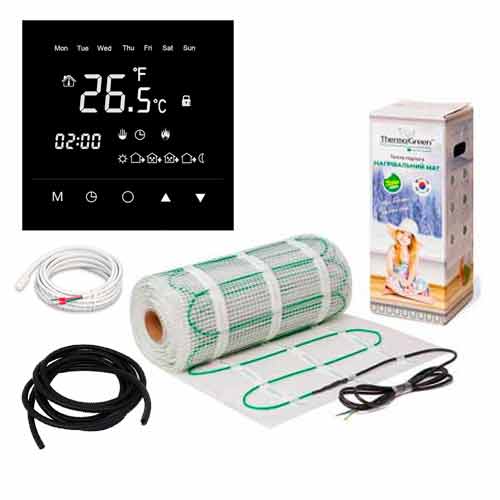 Комплектация | Нагревательный двухжильный мат | Терморегулятор программируемый с сенсорным экраном (черный)| Защитная гофрированная трубка для датчика температуры | Гарантийный талон |
