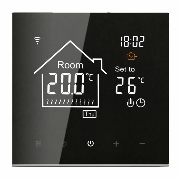 Контроль температуры пола осуществляется благодаря выносному датчику температуры пола (в комплекте) или датчику температуры воздуха (встроенный в корпус). Настройка производится сенсорами на лицевой панели или через приложение в смартфоне. Лицевая панель выполнена из стекла. Это придает терморегулятору стиль, современность и дороговизну. Устанавливается в подрозетник формата 65х45 или 65х60.