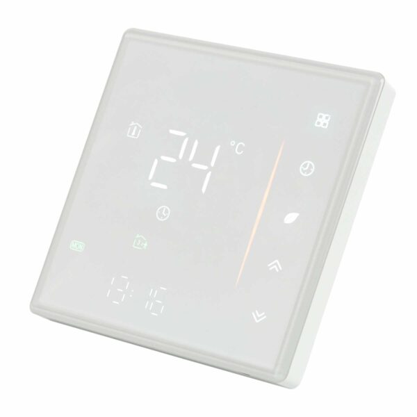 Контроль температуры пола осуществляется благодаря выносному датчику температуры пола (в комплекте) или датчику температуры воздуха (встроенный в корпус). Настройка производится сенсорами на лицевой панели или через приложение в смартфоне. Устанавливается в подрозетник формата 65х45 или 65х60.