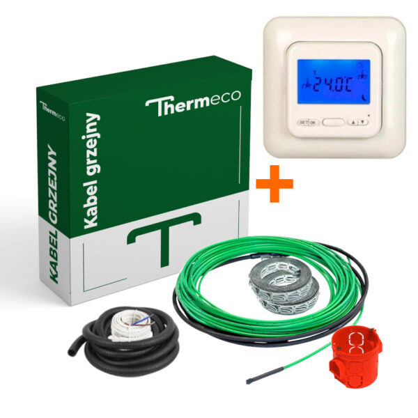 Комплект теплого пола на основе двухжильного нагревательного кабеля Thermeco 18W с программируемым терморегулятором iReg T4, также в комплекте гофрированная трубка, монтажная лента и датчик температуры пола. Применяется для монтажа в стяжку 3-5 см или непосредственно в слой плиточного клея (под толстый керамогранит). Кабель имеет внутреннюю изоляция из TPEE (термостойкого ПВХ) способную выдержать перегрев до 150 градусов. Программируемый терморегулятор позволяет сэкономить до 50% электроэнергии.