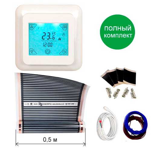 Комплектация | инфракрасная пленка | программируемый терморегулятор с сенсорным экраном T8 | битумный изолятор | клеммы для подключения | провода питания. |