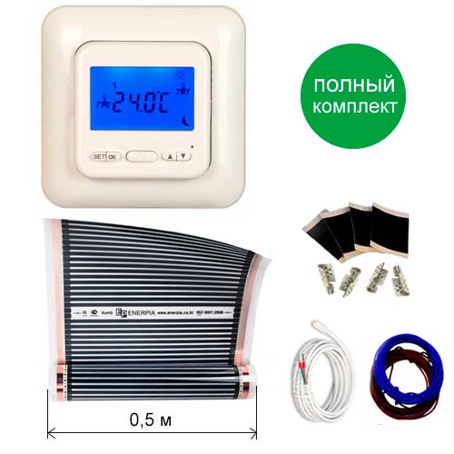 Комплектация | инфракрасная пленка | программируемый терморегулятор T4 | битумный изолятор | клеммы для подключения | провода питания. |