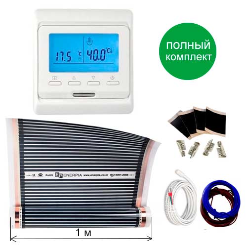 Комплектация | инфракрасная пленка | программируемый терморегулятор с датчиком температуры пола | битумный изолятор | клеммы для подключения | провода питания. |