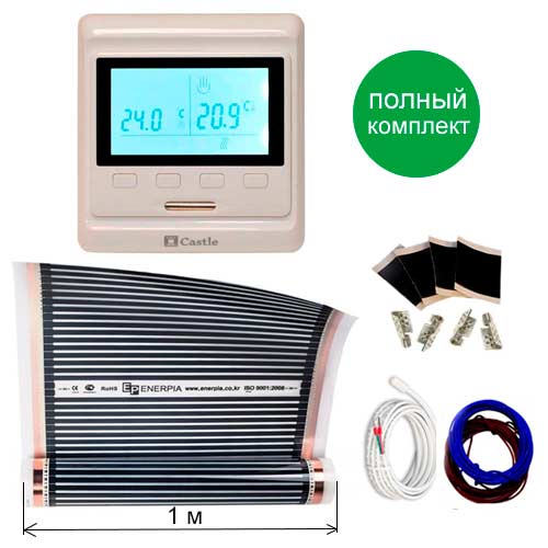 Комплектация | инфракрасная пленка | программируемый терморегулятор с двумя датчиками (пол + воздух) | битумный изолятор | клеммы для подключения | провода питания. |