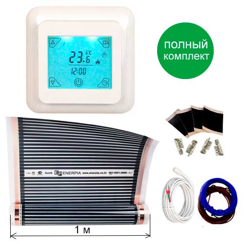 Комплектация | инфракрасная пленка | программируемый терморегулятор с сенсорным экраном T8 | битумный изолятор | клеммы для подключения | провода питания. |