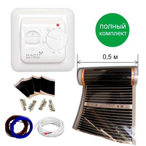 Комплектация | инфракрасная пленка | немецкий терморегулятор MACO TF1640 | битумный изолятор | клеммы для подключения | провода питания. |