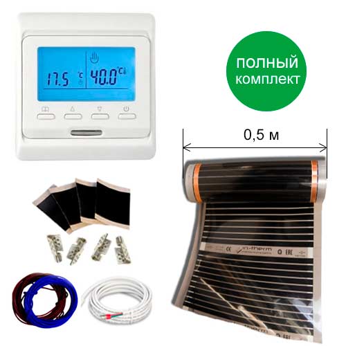 Комплектация | инфракрасная пленка | программируемый терморегулятор с датчиком температуры пола | битумный изолятор | клеммы для подключения | провода питания. |