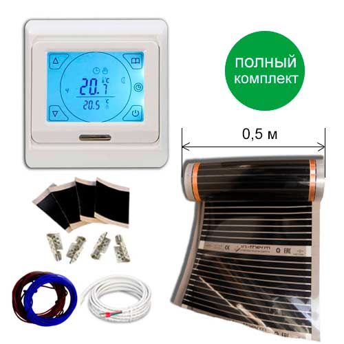 Комплектация | инфракрасная пленка | программируемый терморегулятор с сенсорным экраном | битумный изолятор | клеммы для подключения | провода питания. |