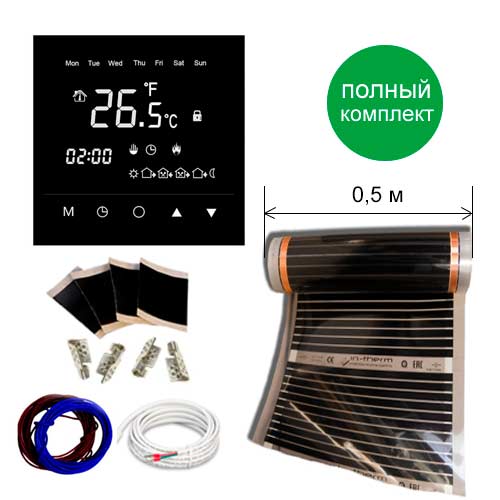 Комплектация | инфракрасная пленка | программируемый терморегулятор с сенсорным экраном (черный) | битумный изолятор | клеммы для подключения | провода питания. |