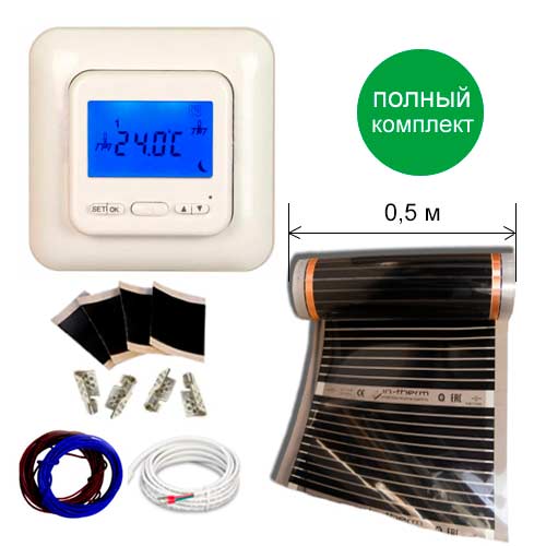 Комплектация | инфракрасная пленка | программируемый терморегулятор T4 | битумный изолятор | клеммы для подключения | провода питания. |