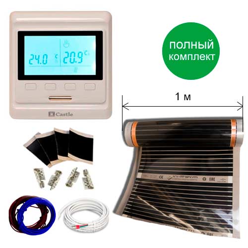 Комплектация | инфракрасная пленка | программируемый терморегулятор с двумя датчиками (пол + воздух) | битумный изолятор | клеммы для подключения | провода питания. |