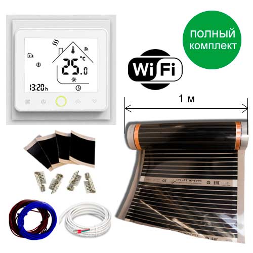 Комплектация | инфракрасная пленка | программируемый WiFi терморегулятор PWT-002 | битумный изолятор | клеммы для подключения | провода питания. |