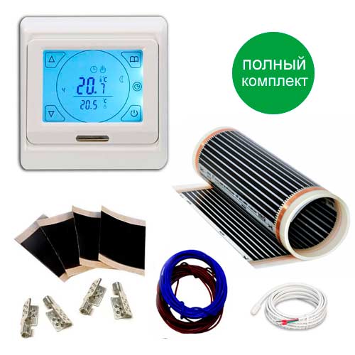 Комплектация | инфракрасная пленка | программируемый терморегулятор с сенсорным экраном | битумный изолятор | клеммы для подключения | провода питания. |