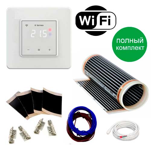 Комплектация | инфракрасная пленка | программируемый WiFi терморегулятор Terneo SX | битумный изолятор | клеммы для подключения | провода питания. |