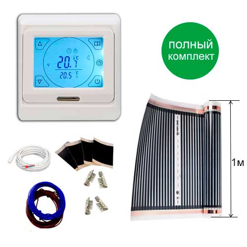 Комплектация | инфракрасная пленка | программируемый терморегулятор с сенсорным экраном | битумный изолятор | клеммы для подключения | провода питания. |