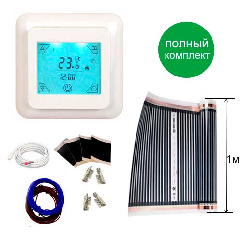 Комплектация | инфракрасная пленка | программируемый терморегулятор с сенсорным экраном T8 | битумный изолятор | клеммы для подключения | провода питания. |