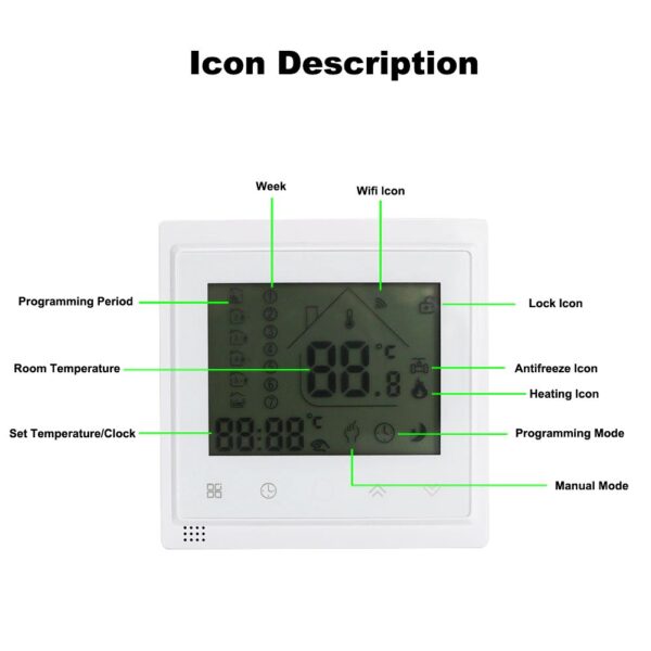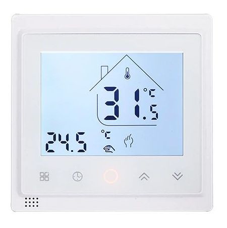 Особенности | Защита от детей (блокировка кнопок), Программируемый режим (недельное рассписание 5+1+1), Ручной режим, Удаленное управление со смартфона через WiFi всеми функциями термостата, Функция "Защита от замерзания" |