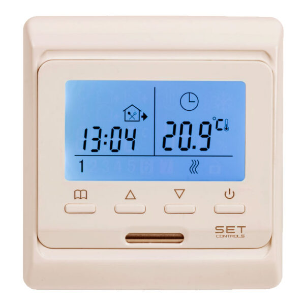 Терморегулятор для теплого пола SET E51.716 (М6.716) кремовый. С функцией программирования и выносным датчиком температуры на проводе, используется для управления электрическим теплым полом (мат, кабель, инфракрасная пленка) и другими системами электроотопления. Терморегулятор имеет встроенный датчик воздуха, пользователю через настройки доступен выбор активного датчика температуры (пол, воздух, пол и воздух).