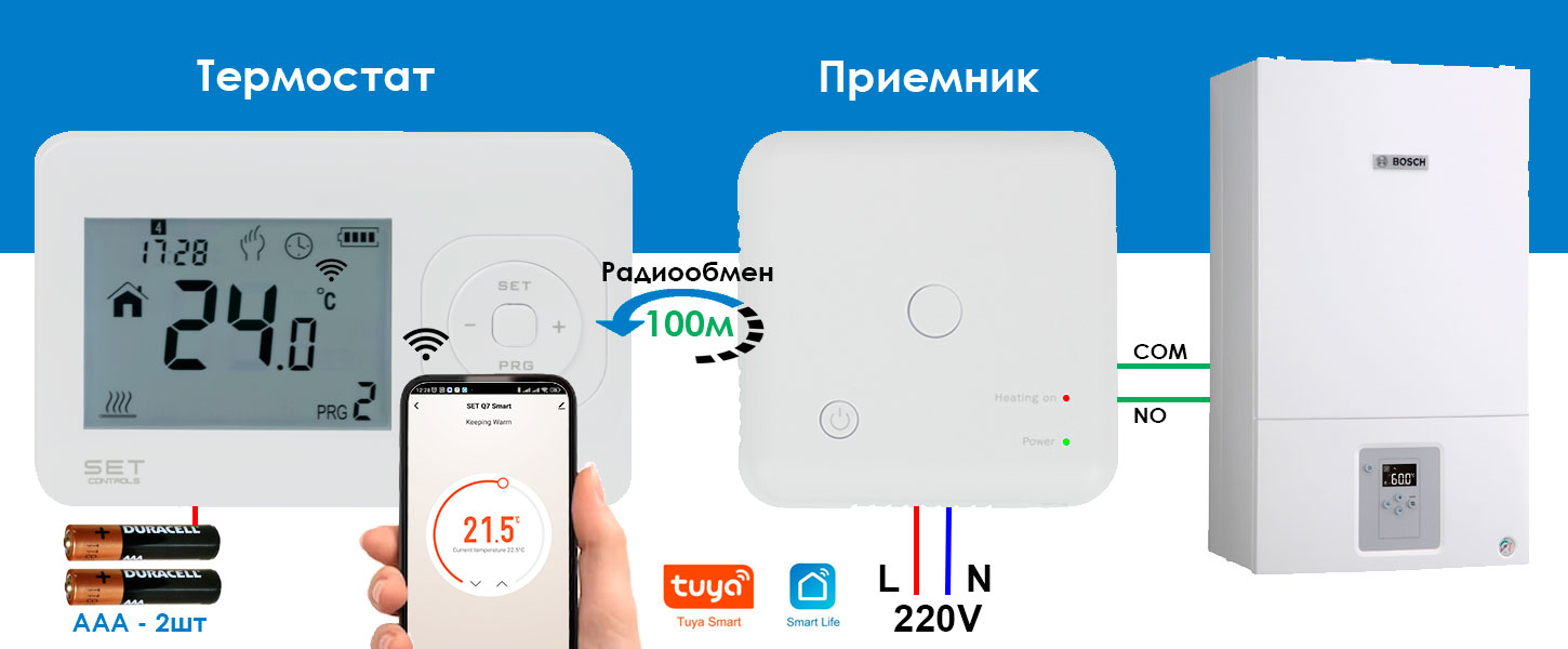 Приемник подключается к котлу. Связь между терморегулятором и приемником осуществляется по радиоканалу. При подключении терморегулятора к сети WiFi появляется возможность управлять терморегулятором дистанционно. Терморегулятор контролирует температуру в помещении и дает сигнал для включения или отключения нагрева.